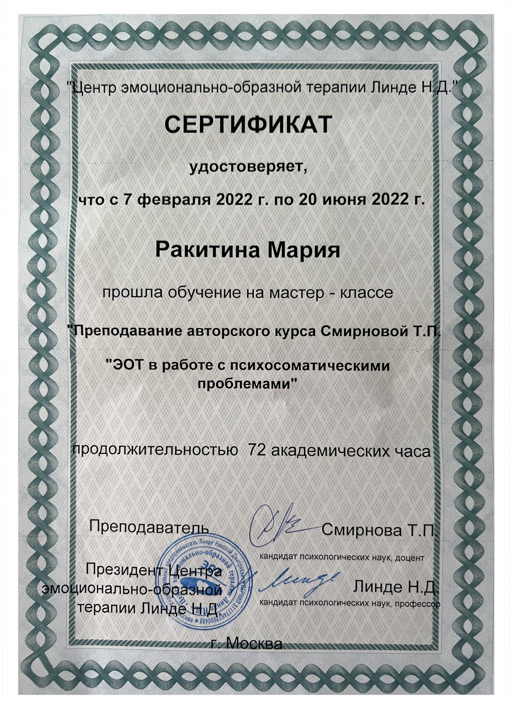 Направление «Психосоматика» в рамках курса клинической психологии выбрала для себя сразу – это был личный интерес, так как в моем теле на тот момент не было, по-моему, ни одной системы, в которой не наблюдалось бы какого-либо изменения (симптома). Я болела и боялась заболеть, боялась заболеть и болела, ежегодно лежала в больницах, пила гормоны, носила корсеты, глотала лекарства, делала массажи, мазалась мазями, молилась и пр.пр.пр. И эта «заевшая пластинка» мне к тому моменту уже изрядно надоела.